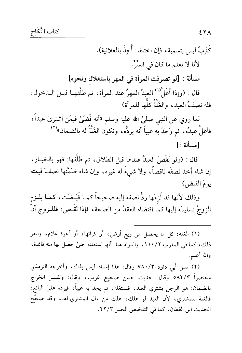 قال: (وإذا أغل العبد المهر عند المرأة، ثم طلقها قبل الدخول: فله نصف العبد، والغلة كلها للمرأة).