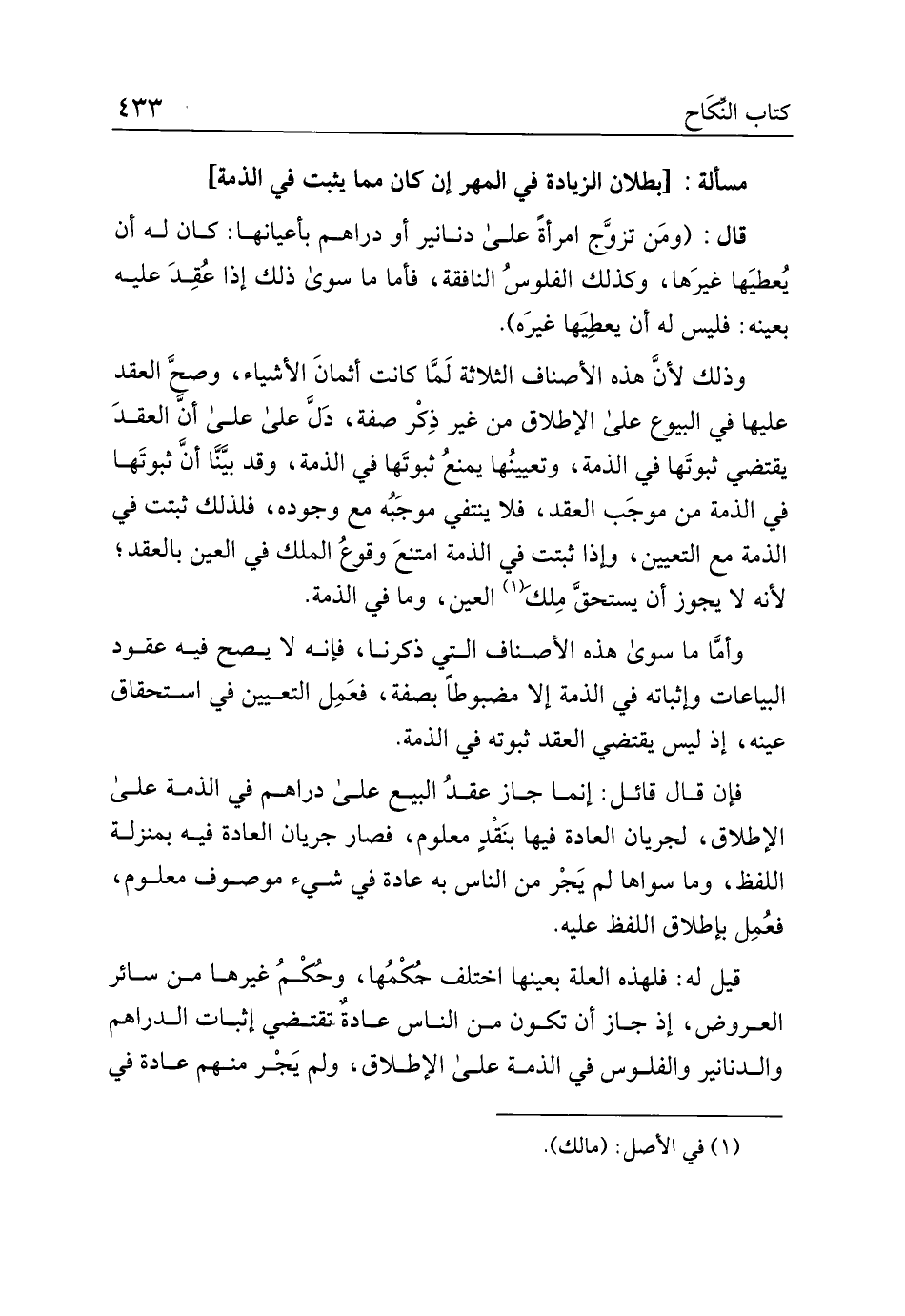 قال: (ومن تزوج امرأة على دنانير أو دراهم بأعيانها: كان له أن يعطيها غيرها، وكذلك الفلوس النافقة، فأما ما سوى ذلك إذا عقد عليه بعينه: فليس له أن يعطيها غيره).