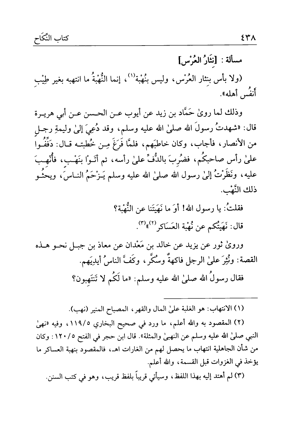 (ولا بأس بنثار العروس، وليس بنهبة، إنما النهبة ما انتهبه بغير طيب أنفس أهله).