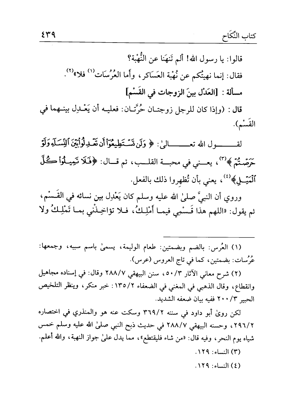 وروي أن النبي صلى الله عليه وسلم كان يعدل بين نسائه في القسم، ثم يقول: "اللهم هذا قسمي فيما أملك، فلا تؤاخذني يما تملك ولا