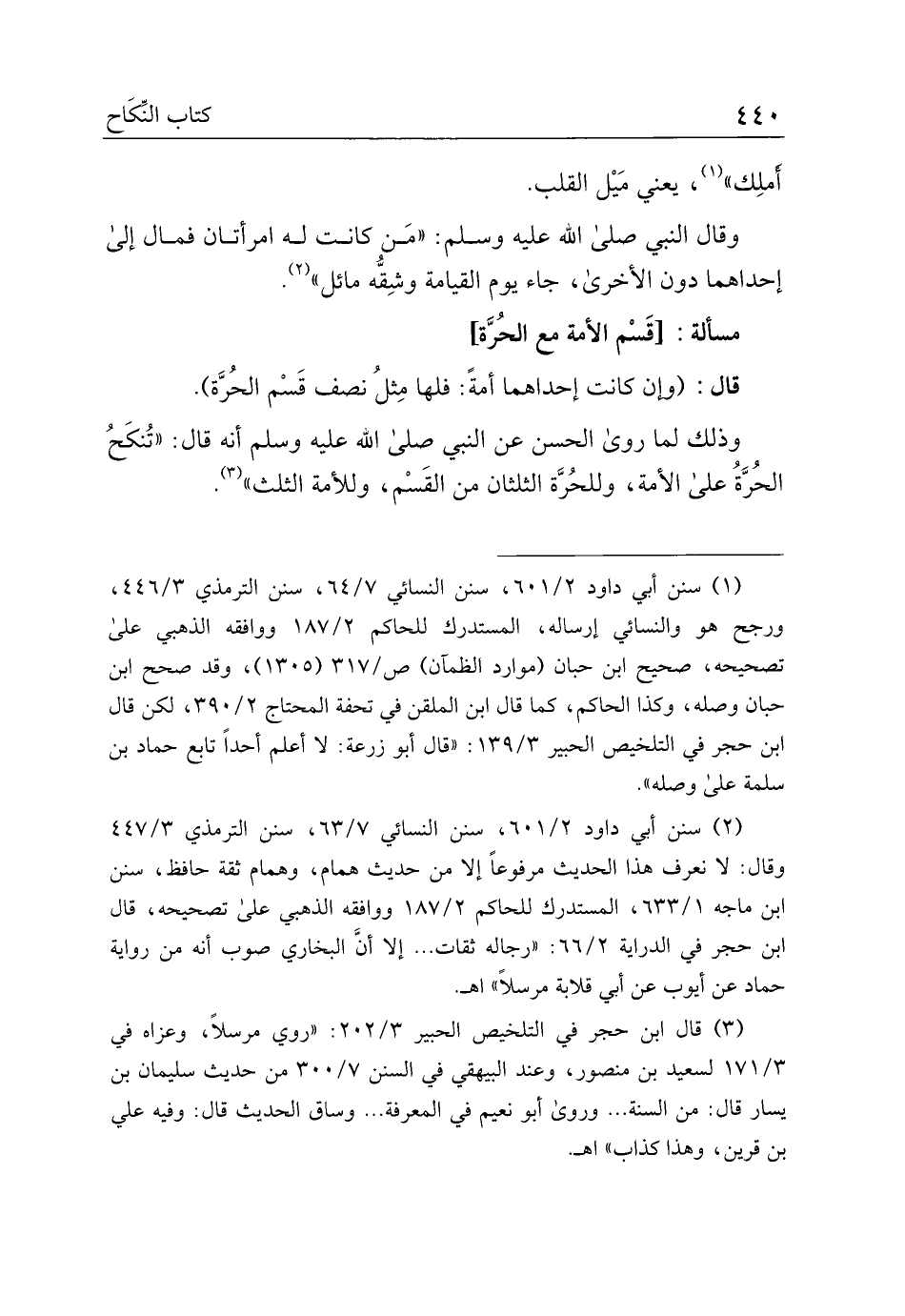 وذلك لما روى الحسن عن النبي صلى الله عليه وسلم أنه قال: "تنكح الحرة على الأمة، وللحرة الثلثان من القسم، وللأمة الثلث".