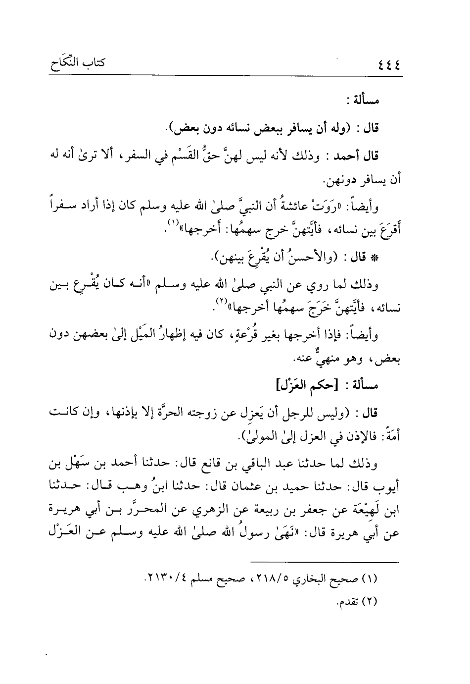وأيضا: "روت عائشة أن النبي صلى الله عليه وسلم كان إذا أراد سفرا أقرع بين نسائه، فأيتهن خرج سهمها: أخرجها".