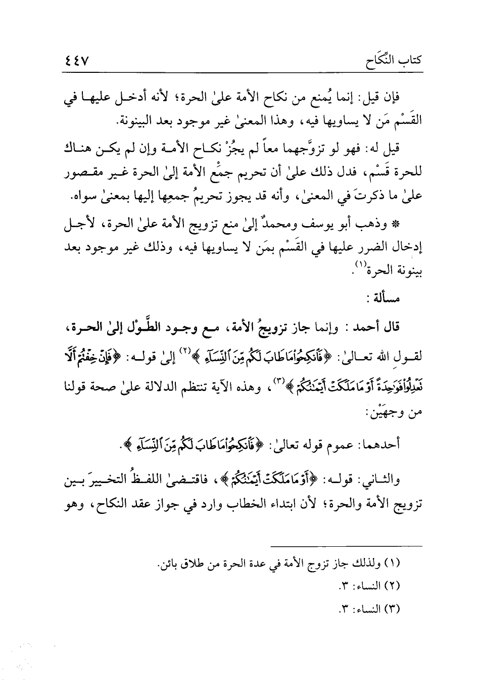 قال أحمد: وإنما جاز تزويج الأمة، مع وجود الطول إلى الحرة لقول الله تعالى: {فانكحوا ما طاب لكم من النساء}، إلى قوله: {فإن خفتم ألا تعدلوا فواحدة أو ما ملكت أيمانكم}، وهذه الآية تنتظم الدلالة على صحة قولنا من وجهين: