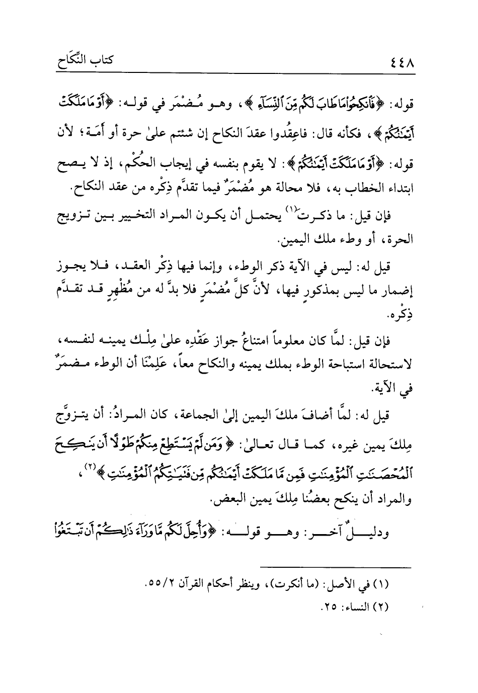 قوله: {فانكحوا ما طاب لكم من النساء}، وهو مضمر في قوله: {أو ما ملكت أيمانكم}، فكأنه فال: فاعقدوا عقد النكاح إن شئتم على حرة أو أمة؛ لأن قوله: {أو ملكت أيمانكم}: لا يقوم بنفسه في إيجاب الحكم، إذ لا يصح ابتداء الخطاب به، فلا محالة هو مضمر فيما تقدم ذكره من عقد النكاح.