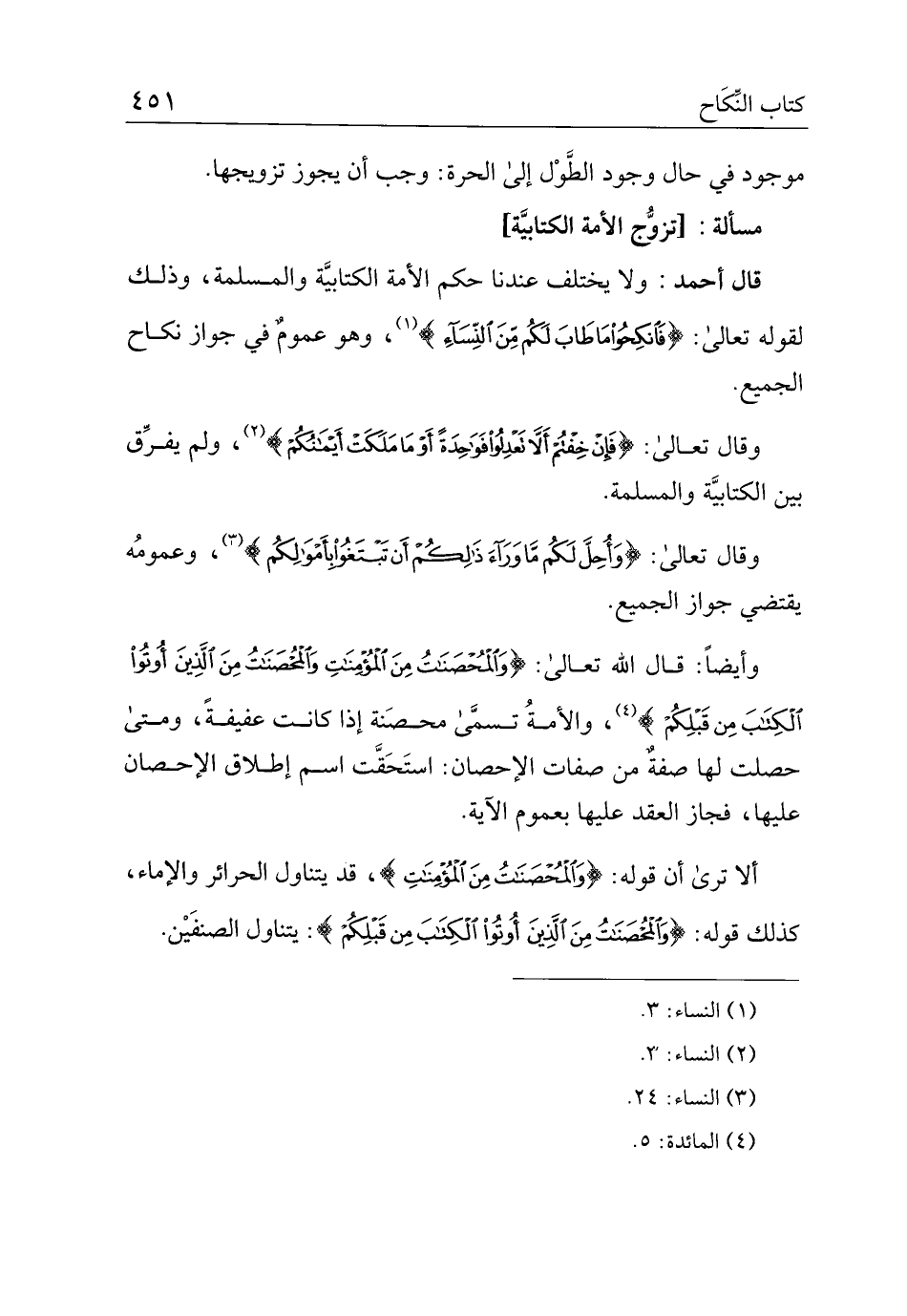 قال أحمد: ولا يختلف عندنا حكم الأمة الكتابية والمسلمة، وذلك لقوله تعالى: {فانكحوا ما طاب لكم من النساء}، وهو عموم في جواز نكاح الجميع.