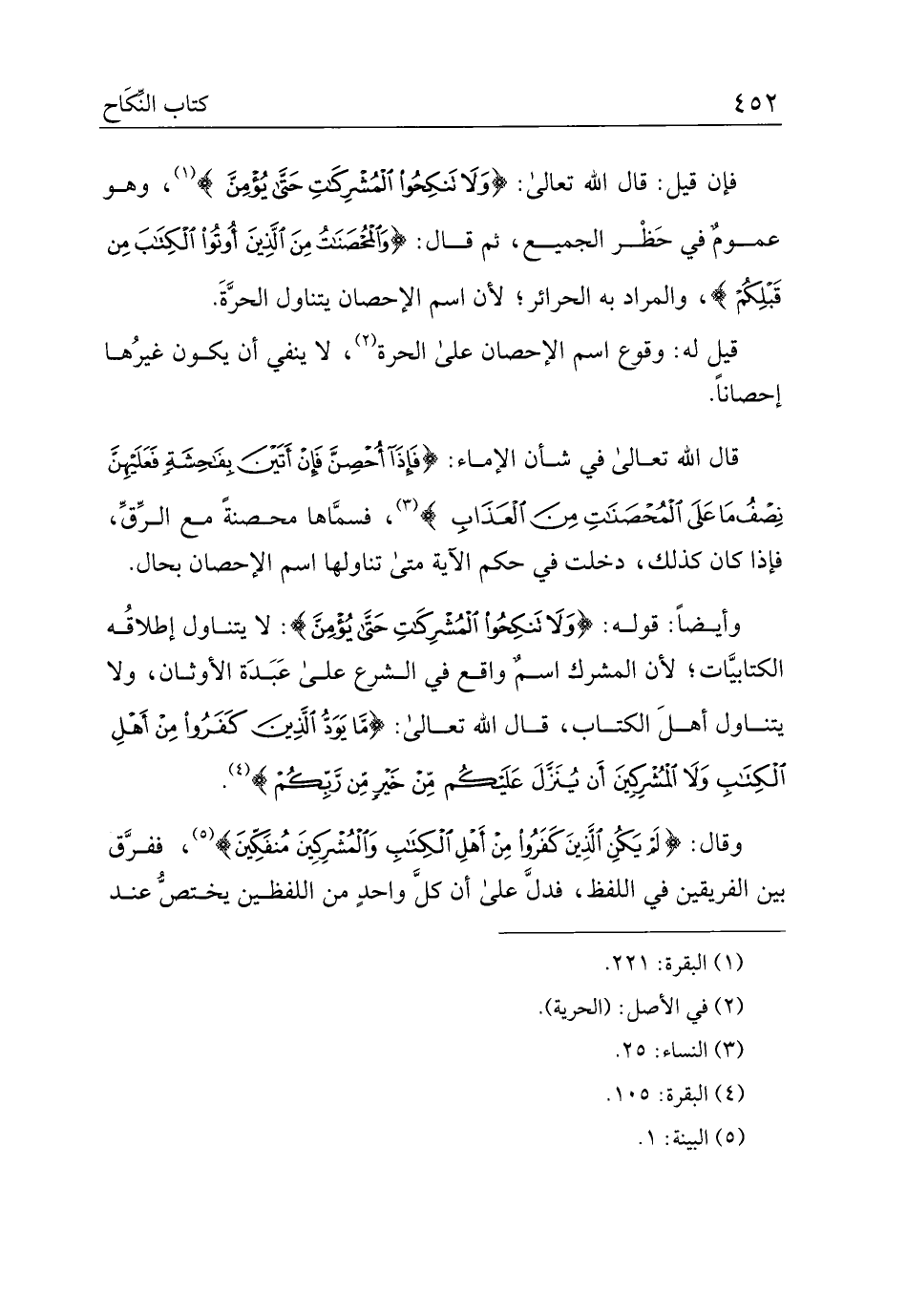 فإن قيل: قال الله تعالى: {ولا تنكحوا المشركات حتى يؤمن}، وهو عموم في حظر الجميع، ثم قال: {والمحصنات من الذين أوتوا الكتاب من قبلكم}، والمراد به الحرائر؛ لأن اسم الإحصان يتناول الحرة.