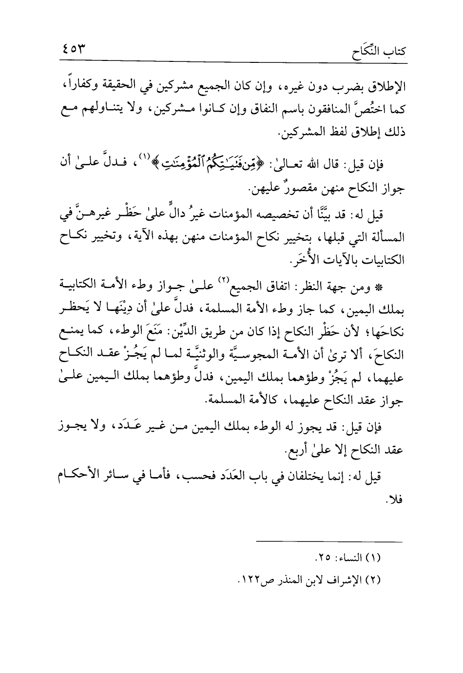 *ومن جهة النظر: اتفاق الجميع على جواز وطء الأمة الكتابية بملك اليمين، كما جاز وطء الأمة المسلمة، فدل على أن دينها لا يحظر نكاحها؛ لأن حظر النكاح إذا كان من طريق الدين: منع الوطء، كما يمنع النكاح، ألا ترى أن الأمة المجوسية والوثنية لما لم يجز عقد النكاح عليهما، لم يجز وطؤهما بملك اليمين، فدل وطؤهما بملك اليمين على جواز عقد النكاح عليهما، كالأمة المسلمة.