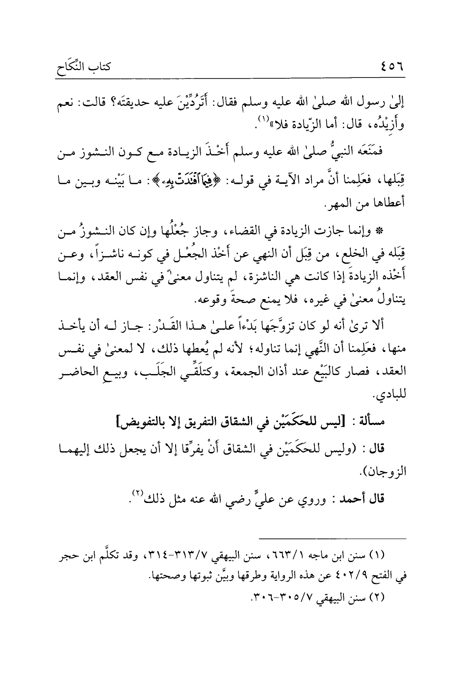 فمنعه النبي صلى الله عليه وسلم أخذ الزيادة مع كون النشوز من قبلها، فعلمنا أن مراد الآية في قوله: {فيما افتدت به}: ما بينه وبين ما أعطاها من المهر.