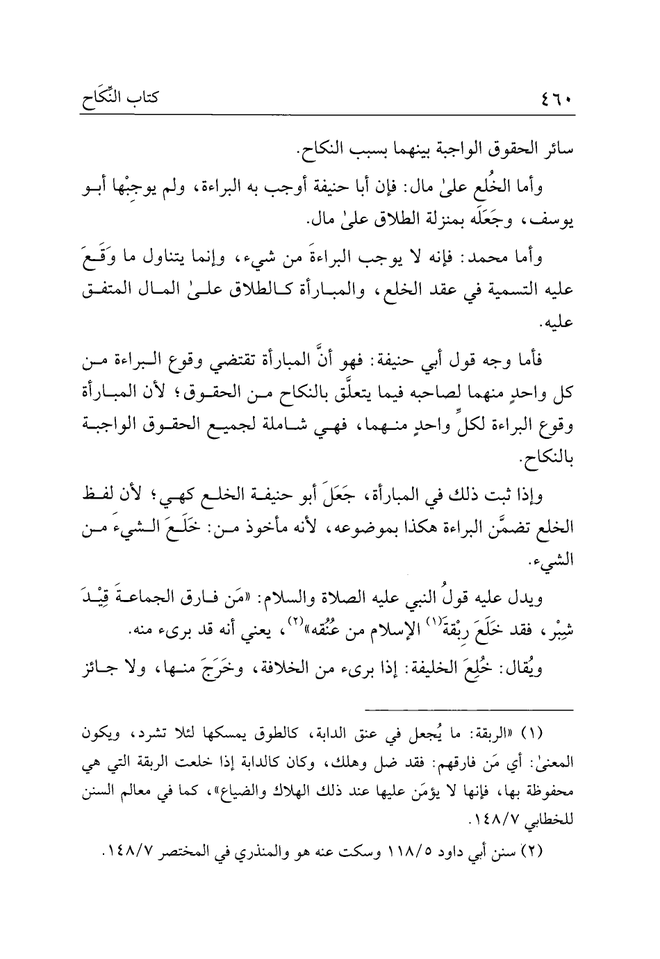 فأما وجه قول أبي حنيفة: فهو أن المبارأة تقتضي وقوع البراءة من كل واحد منهما لصاحبه فيما يتعلق بالنكاح من الحقوق؛ لأن المبارأة وقوع البراءة لكل واحد منهما، فهي شاملة لجميع الحقوق الواجبة بالنكاح.