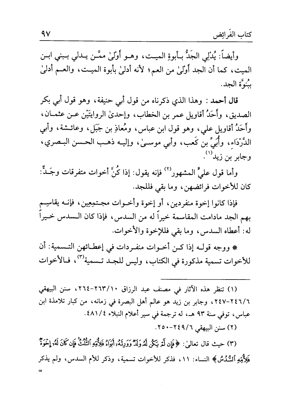 قال أحمد: وهذا الذي ذكرناه من قول أبي حنيفة، وهو قول أبي بكر الصديق، وأحد أقاويل عمر بن الخطاب، وإحدى الروايتين عن عثمان، وأحد أقاويل علي، وهو قول ابن عباس، ومعاذ بن جبل، وعائشة، وأبي الدرداء، وأبي بن كعب، وأبي موسى، وإليه ذهب الحسن البصري، وجابر بن زيد.