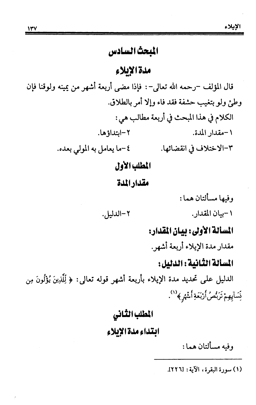 الدليل على تحديد مدة الإيلاء بأربعة أشهر قوله تعالى: {لِلَّذِينَ يُؤْلُونَ مِنْ نِسَائِهِمْ تَرَبُّصُ أَرْبَعَةِ أَشْهُرٍ} (¬1).