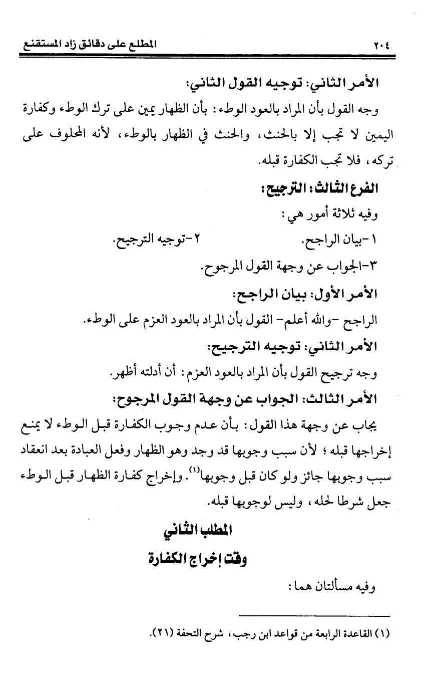 يجاب عن وجهة هذا القول: بأن عدم وجوب الكفارة قبل الوطء لا يمنع إخراجها قبله؛ لأنَّ سبب وجوبها قد وجد وهو الظهار وفعل العبادة بعد انعقاد سبب وجوبها جائز ولو كان قبل وجوبها (¬1). وإخراج كفارة الظهار قبل الوطء جعل شرطا لحله، وليس لوجوبها قبله.