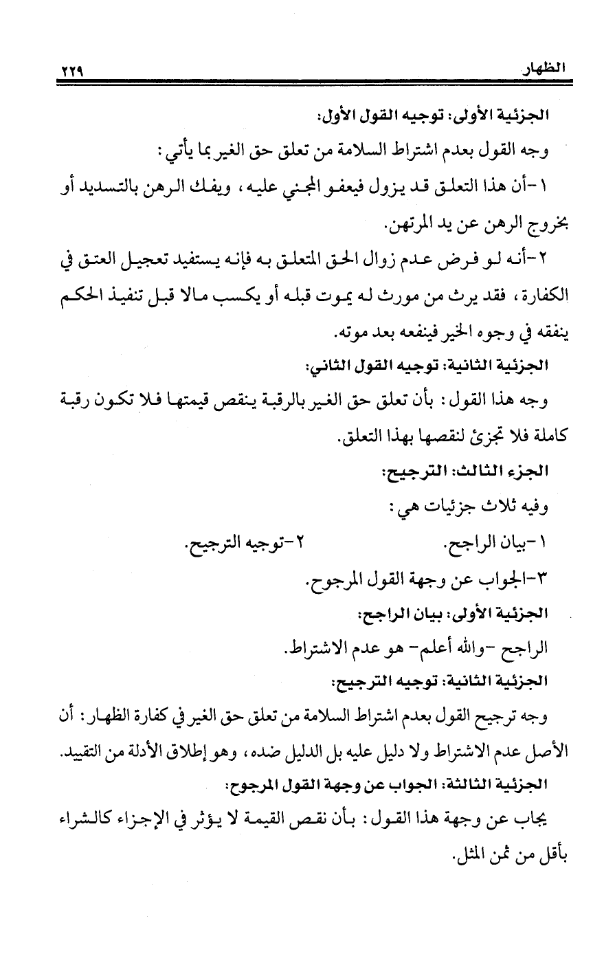 وجه ترجيح القول بعدم اشتراط السلامة من تعلق حق الغير في كفارة الظهار: أن الأصل عدم الاشتراط ولا دليل عليه بل الدليل ضده، وهو إطلاق الأدلة من التقييد.
