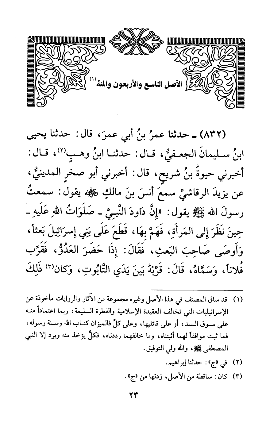 832 - حدثنا عمر بن أبي عمر، قال: حدثنا يحيى ابن سليمان الجعفي، قال: حدثنا ابن وهبٍ، قال: أخبرني حيوة بن شريحٍ، قال: أخبرني أبو صخرٍ المديني، عن يزيد الرقاشي سمع أنس بن مالكٍ رضي الله عنه يقول: سمعت رسول الله صلى الله عليه وسلم يقول: ((إن داود النبي -صلوات الله عليه- حين نظر إلى المرأة، فهم بها، قطع على بني إسرائيل بعثاً، وأوصى صاحب البعث، فقال: إذا حضر العدو، فقرب فلاناً، وسماه، قال: قربه بين يدي التابوت، وكان ذلك