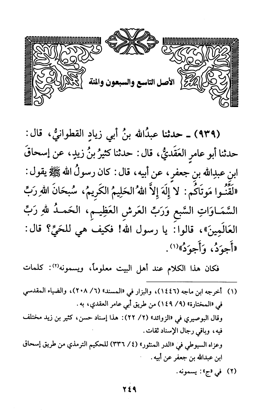 939 - حدثنا عبد الله بن أبي زيادٍ القطواني، قال: حدثنا أبو عامرٍ العقدي، قال: حدثنا كثير بن زيدٍ، عن إسحاق ابن عبد الله بن جعفرٍ، عن أبيه، قال: كان رسول الله صلى الله عليه وسلم يقول: ((لقنوا موتاكم: لا إله إلا الله الحليم الكريم، سبحان الله رب السماوات السبع وربع العرش العظيم، الحمد لله رب العالمين))، قالوا: يا رسول الله! فكيف هي للحي؟ قال: ((أجود، وأجود)).