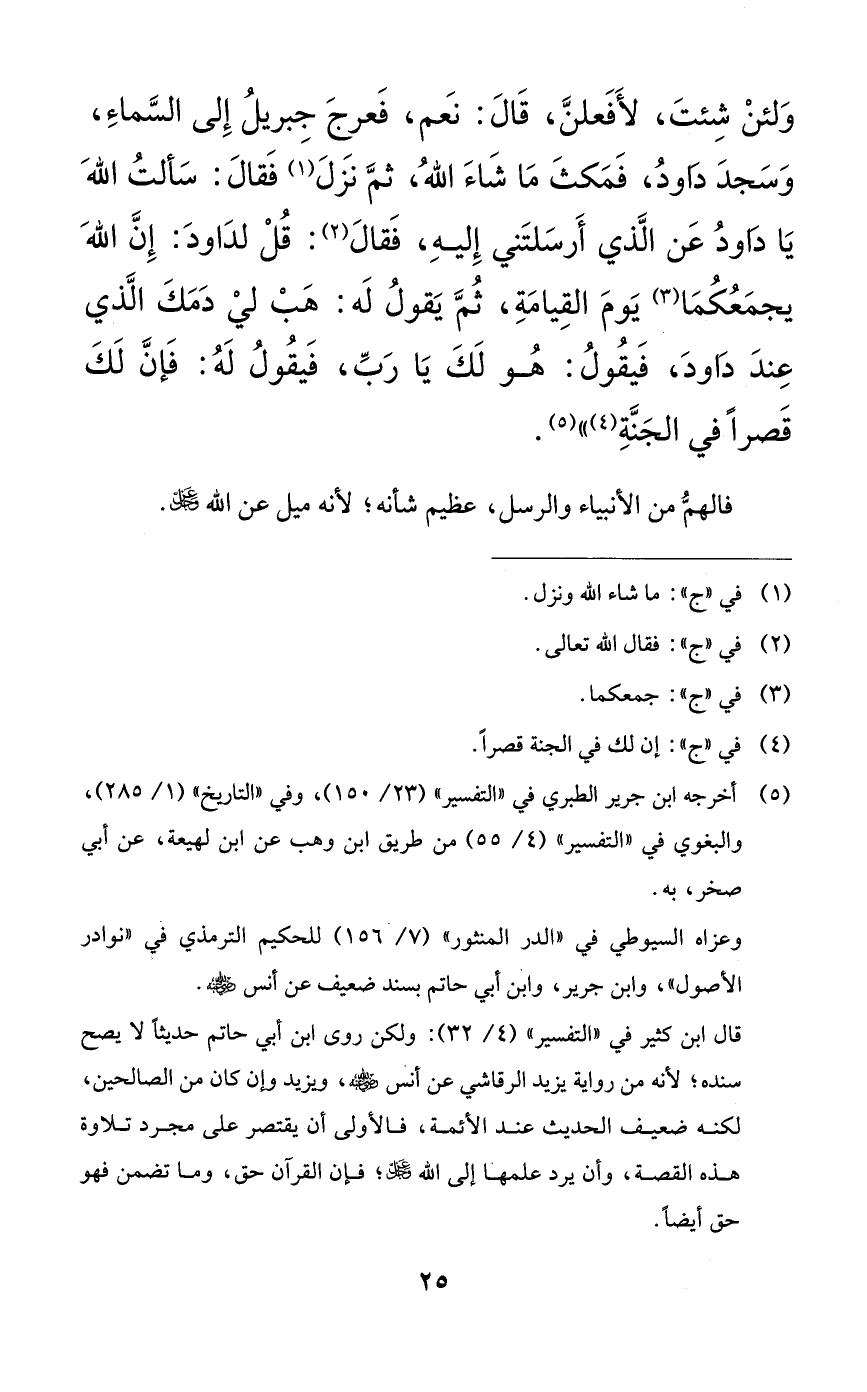 ولئن شئت، لأفعلن، قال: نعم، فعرج جبريل إلى السماء، وسجد داود، فمكث ما شاء الله، ثم نزل فقال: سألت الله يا داود عن الذي أرسلتني إليه، فقال: قل لداود: إن الله يجمعكما يوم القيامة، ثم يقول له: هب لي دمك الذي عند داود، فيقول: هو لك يا رب، فيقول له: فإن لك قصراً في الجنة)).