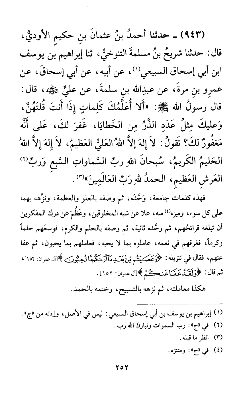 943 - حدثنا أحمد بن عثمان بن حكيمٍ الأودي، قال: حدثنا شريح بن مسلمة التنوخي، ثنا إبراهيم بن يوسف ابن أبي إسحاق السبيعي، عن أبيه، عن أبي إسحاق، عن عمرو بن مرة، عن عبد الله بن سلمة، عن عليٍّ رضي الله عنه، قال: قال رسول الله صلى الله عليه وسلم: ((ألا أعلمك كلماتٍ إذا أنت قلتهن، وعليك مثل عدد الذر من الخطايا، غفر لك، على أنه مغفورٌ لك؟ تقول: لا إله إلا الله العلي العظيم، لا إله إلا الله الحليم الكريم، سبحان الله رب السماوات السبع ورب العرش العظيم، الحمد لله رب العالمين)).