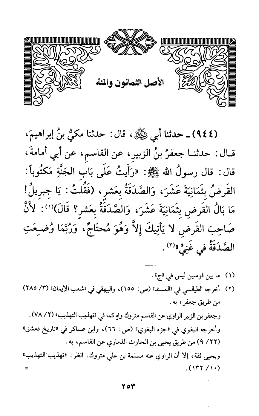 944 - حدثنا أبي رحمه الله، قال: حدثنا مكي بن إبراهيم، قال: حدثنا جعفر بن الزبير، عن القاسم، عن أبي أمامة، قال: قال رسول الله صلى الله عليه وسلم: ((رأيت على باب الجنة مكتوباً: القرض بثمانية عشر، والصدقة بعشرٍ، (فقلت: يا جبريل! ما بال القرض بثمانية عشر، والصدقة بعشرٍ؟ قال): لأن صاحب القرض لا يأتيك إلا وهو محتاجٌ، وربما وضعت الصدقة في غنيٍّ)).