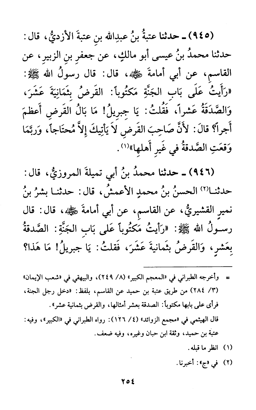 945 - حدثنا عتبة بن عبد الله بن عتبة الأزدي، قال: حدثنا محمد بن عيسى أبو مالكٍ، عن جعفر بن الزبير، عن القاسم، عن أبي أمامة رضي الله عنه، قال: قال رسول الله صلى الله عليه وسلم: ((رأيت على باب الجنة مكتوباً: القرض بثمانية عشر، والصدقة عشراً، فقلت: يا جبريل! ما بال القرض أعظم أجراً؟ قال: لأن صاحب القرض لا يأتيك إلا محتاجاً، وربما وقعت الصدقة في غير أهلها)).