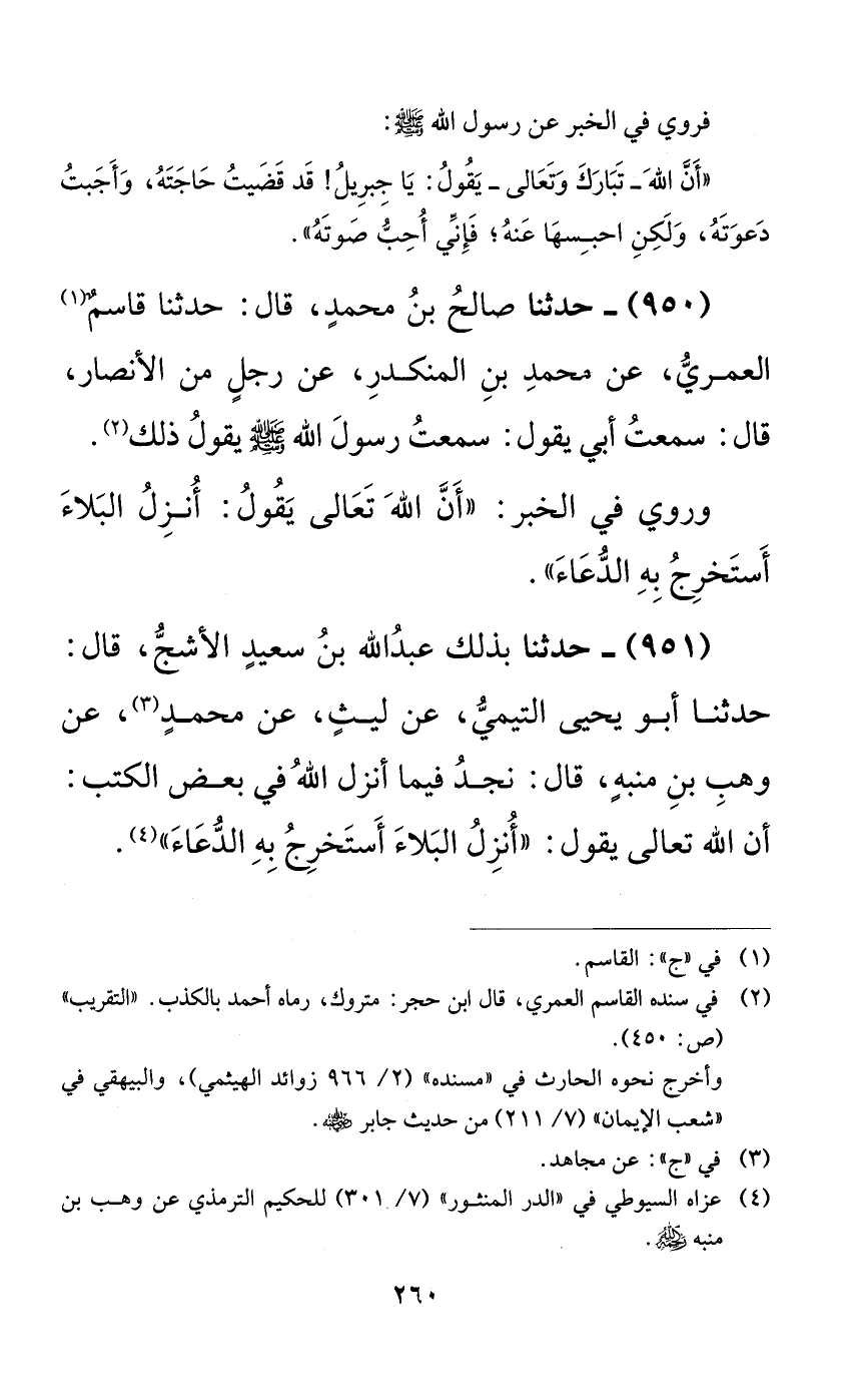 951 - حدثنا بذلك عبد الله بن سعيدٍ الأشج، قال: حدثنا أبو يحيى التيمي، عن ليثٍ، عن محمدٍ، عن وهب بن منبهٍ، قال: نجد فيما أنزل الله في بعض الكتب: أن الله تعالى يقول: ((أنزل البلاء أستخرج به الدعاء)).