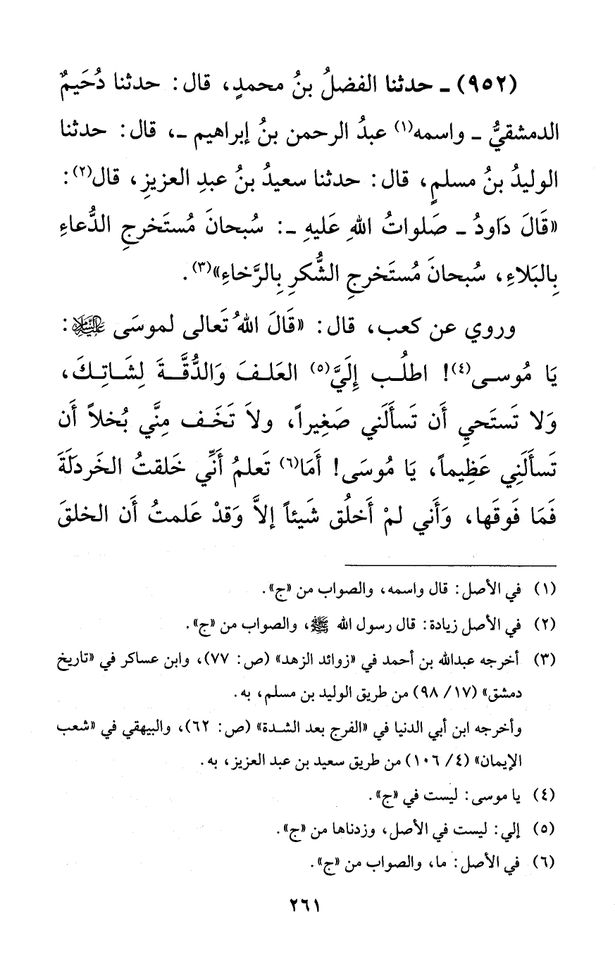 952 - حدثنا الفضل بن محمدٍ، قال: حدثنا دحيمٌ الدمشقي -واسمه عبد الرحمن بن إبراهيم-، قال: حدثنا الوليد بن مسلمٍ، قال: حدثنا سعيد بن عبد العزيز، قال: ((قال داود -صلوات الله عليه-: سبحان مستخرج الدعاء بالبلاء، سبحان مستخرج الشكر بالرخاء)).