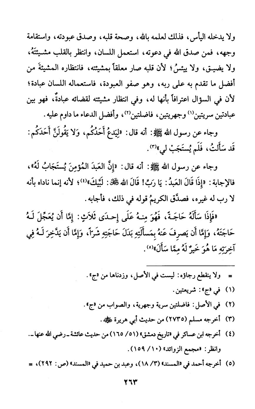 ولا يدخله اليأس، فذلك لعلمه بالله، وصحة قلبه، وصدق عبودته، واستقامة وجهه، فمن صدق الله في دعوته، استعمل اللسان، وانتظر بالقلب مشيئته، ولا يضيق، ولا ييئس؛ لأن قلبه صار معلقاً بمشيئته، فانتظاره المشيئة من أفضل ما تقدم به على ربه، وهو صفو العبودة، فاستعماله اللسان عبادة؛ لأن في السؤال اعترافاً بأنها له، وفي انتظار مشيئته لقضائه عبادةٌ، فهو بين عبادتين سريتين وجهريتين، فاضلتين، وأفضل الدعاء ما داوم عليه.