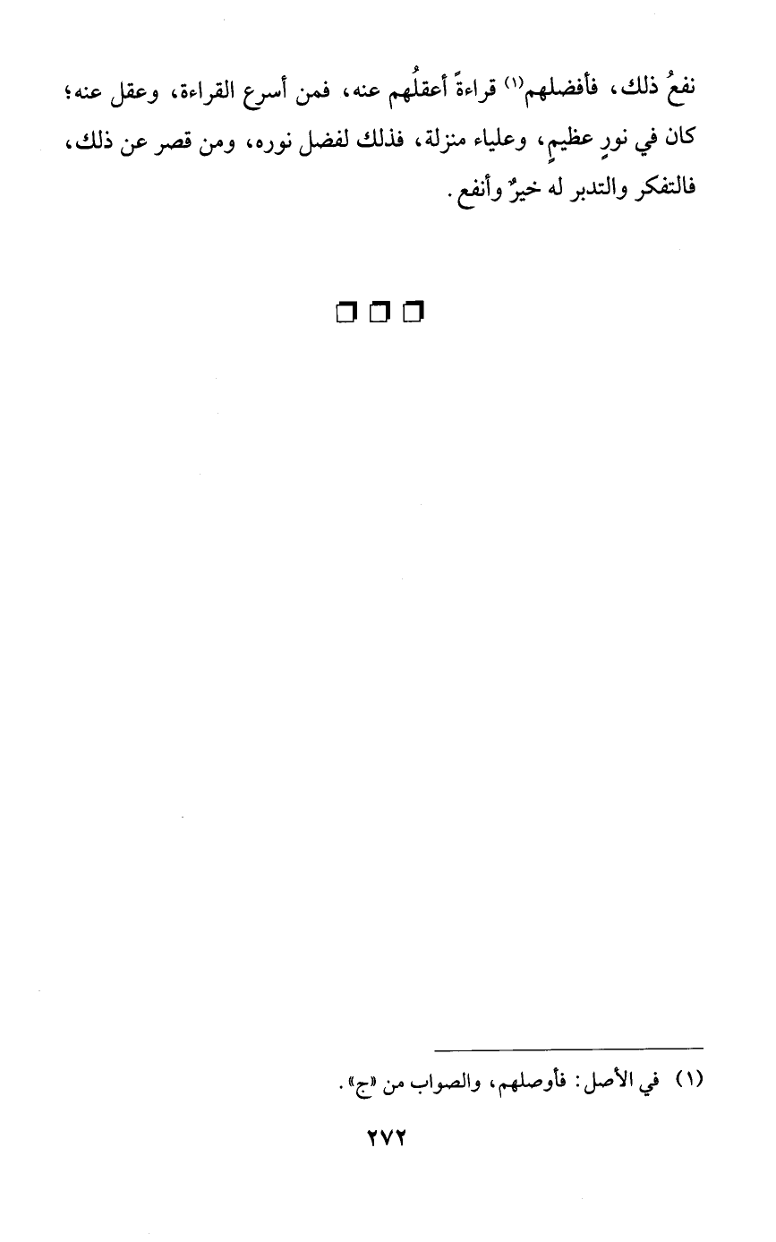 نفع ذلك، فأفضلهم قراءةً أعقلهم عنه، فمن أسرع القراءة، وعقل عنه؛ كان في نورٍ عظيمٍ، وعلياء منزلة، فذلك لفضل نوره، ومن قصر عن ذلك، فالتفكر والتدبر له خيرٌ وأنفع.