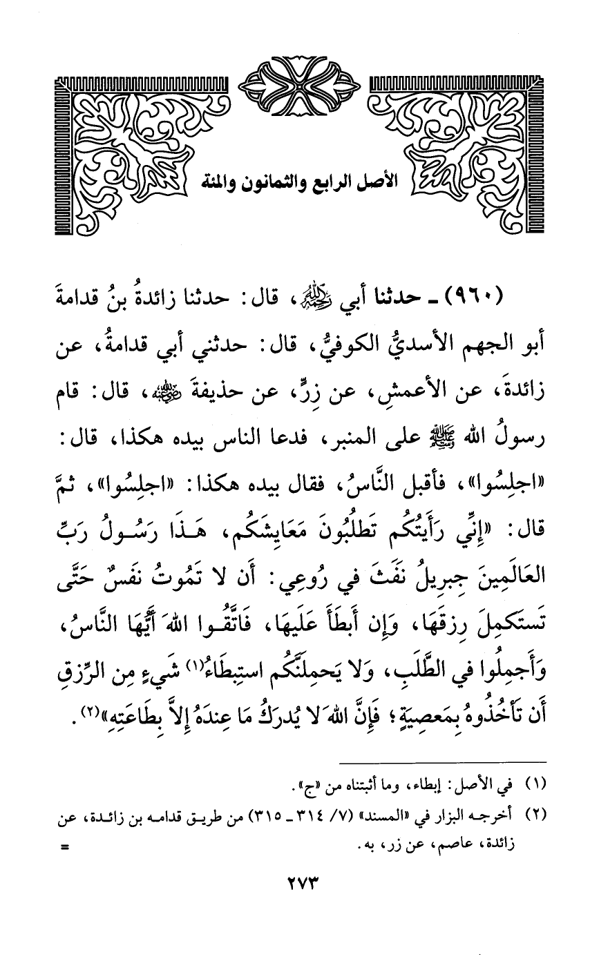 960 - حدثنا أبي رحمه الله، قال: حدثنا زائدة بن قدامة أبو الجهم الأسدي الكوفي، قال: حدثني أبي قدامة، عن زائدة، عن الأعمش، عن زرٍّ، عن حذيفة رضي الله عنه، قال: قام رسول الله صلى الله عليه وسلم على المنبر، فدعا الناس بيده هكذا، قال: ((اجلسوا))، فأقبل الناس، فقال بيده هكذا: ((اجلسوا))، ثم قال: ((إني رأيتكم تطلبون معايشكم، هذا رسول رب العالمين جبريل نفث في روعي: أن لا تموت نفسٌ حتى تستكمل رزقها، وإن أبطأ عليها، فاتقوا الله أيها الناس، وأجملوا في الطلب، ولا يحملنكم استبطاء شيءٍ من الرزق أن تأخذوه بمعصيةٍ؛ فإن الله لا يدرك ما عنده إلا بطاعته)).