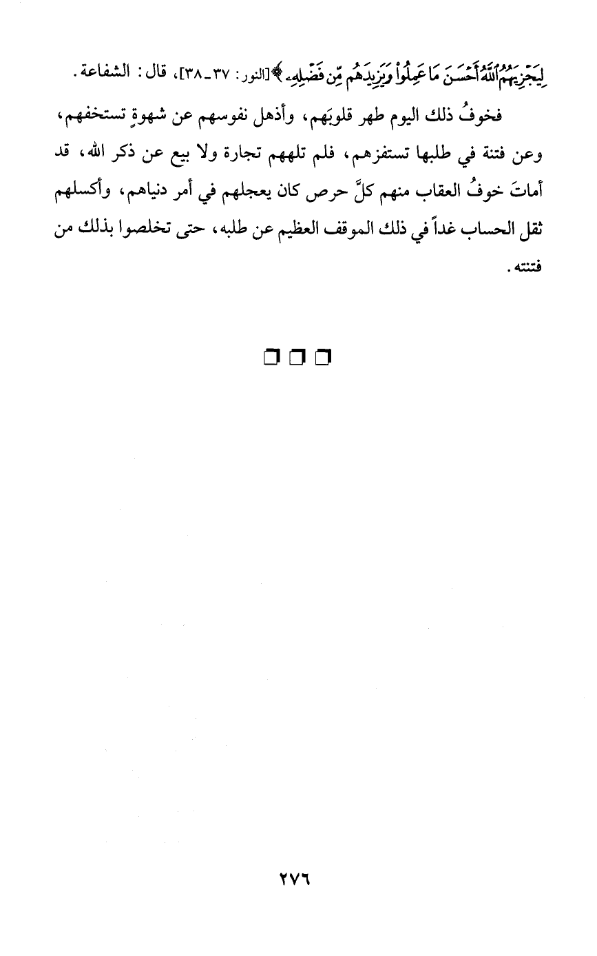 فخوف ذلك اليوم طهر قلوبهم، وأذهل نفوسهم عن شهوةٍ تستخفهم، وعن فتنة في طلبها تستفزهم، فلم تلههم تجارة ولا بيع عن ذكر الله، قد أمات خوف العقاب منهم كل حرص كان يعجلهم في أمر دنياهم، وأكسلهم ثقل الحساب غداً في ذلك الموقف العظيم عن طلبه، حتى تخلصوا بذلك من فتنته.