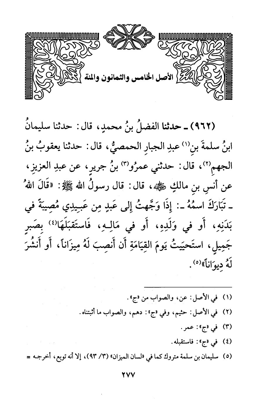 962 - حدثنا الفضل بن محمدٍ، قال: حدثنا سليمان ابن سلمة بن عبد الجبار الحمصي، قال: حدثنا يعقوب بن الجهم، قال: حدثني عمرو بن جريرٍ، عن عبد العزيز، عن أنس بن مالكٍ رضي الله عنه، قال: قال رسول الله صلى الله عليه وسلم: ((قال الله -تبارك اسمه-: إذا وجهت إلى عبدٍ من عبيدي مصيبةً في بدنه، أو في ولده، أو في ماله، فاستقبلها بصبرٍ جميلٍ، استحييت يوم القيامة أن أنصب له ميزاناً، أو أنشر له ديواناً.