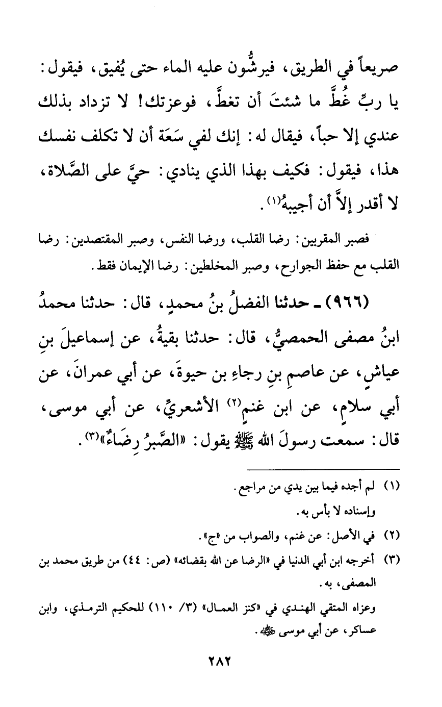 966 - حدثنا الفضل بن محمدٍ، قال: حدثنا محمد ابن مصفى الحمصي، قال: حدثنا بقية، عن إسماعيل بن عياشٍ، عن عاصم بن رجاء بن حيوة، عن أبي عمران، عن أبي سلامٍ، عن ابن غنمٍ الأشعري، عن أبي موسى، قال: سمعت رسول الله صلى الله عليه وسلم يقول: ((الصبر رضاءٌ)).