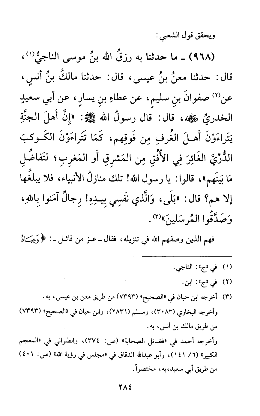 968 - ما حدثنا به رزق الله بن موسى الناجي، قال: حدثنا معن بن عيسى، قال: حدثنا مالك بن أنسٍ، عن صفوان بن سليمٍ، عن عطاء بن يسارٍ، عن أبي سعيد الخدري رضي الله عنه، قال: قال رسول الله صلى الله عليه وسلم: ((إن أهل الجنة يتراءون أهل الغرف من فوقهم، كما تتراءون الكوكب الدري الغائر في الأفق من المشرق أو المغرب؛ لتفاضل ما بينهم))، قالوا: يا رسول الله! تلك منازل الأنبياء، فلا يبلغها إلا هم؟ قال: ((بلى، والذي نفسي بيده! رجالٌ آمنوا بالله، وصدقوا المرسلين)).