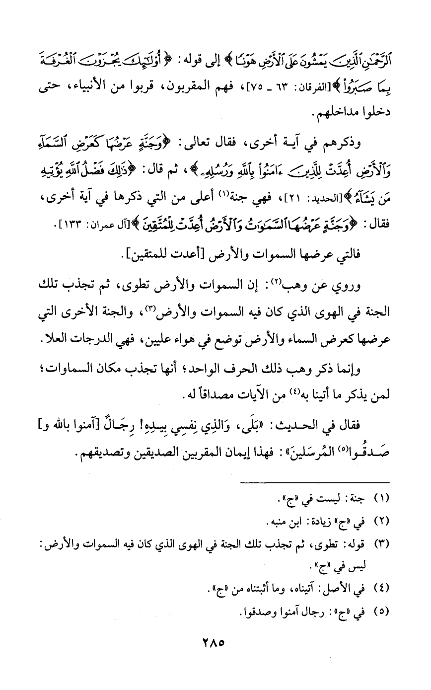 وذكرهم في آية أخرى، فقال تعالى: {وجنةٍ عرضها كعرض السماء والأرض أعدت للذين آمنوا بالله ورسله}، ثم قال: {ذلك فضل الله يؤتيه من يشاء}، فهي جنة أعلى من التي ذكرها في آية أخرى، فقال: {وجنةٍ عرضها السماوات والأرض أعدت للمتقين}.