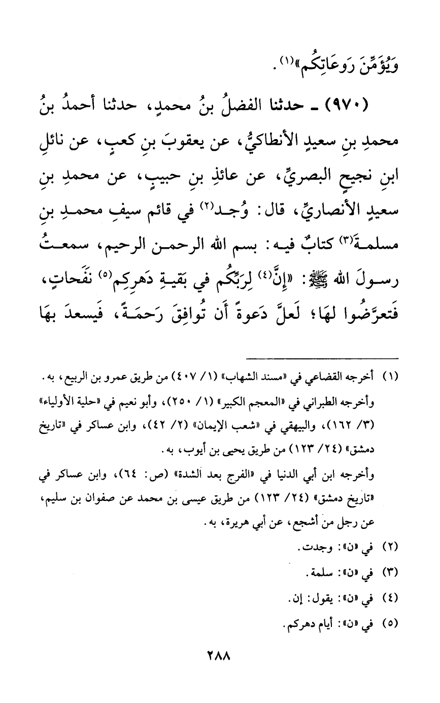 970 - حدثنا الفضل بن محمدٍ، حدثنا أحمد بن محمد بن سعيدٍ الأنطاكي، عن يعقوب بن كعبٍ، عن نائل ابن نجيح البصري، عن عائذ بن حبيبٍ، عن محمد بن سعيد الأنصاري، قال: وجد في قائم سيف محمد بن مسلمة كتابٌ فيه: بسم الله الرحمن الرحيم، سمعت رسول الله صلى الله عليه وسلم: ((إن لربكم في بقية دهركم نفحاتٍ، فتعرضوا لها؛ لعل دعوةً أن توافق رحمةً، فيسعد بها