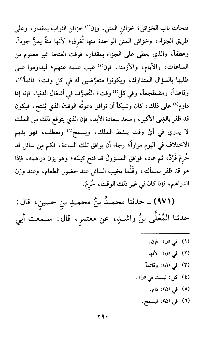 فتحات باب الخزائن، خزائن المنن، وإن خزائن الثواب بمقدار، وعلى طريق الجزاء، وخزائن المنن الواحدة منها تغرق؛ لأنها منةٌ يمن جوداً، وعطفاً، والذي يعطى على الجزاء بمقدار فوقت الفتحة غير معلوم من الساعات، والأيام، والأزمنة، فإن غيب علمه عنهم؛ ليداوموا على طلبها بالسؤال المتدارك، ويكونوا متعرضين له في كل وقت؛ قائماً، وقاعداً، ومضطجعاً، وفي كل وقت؛ التصرف في أشغال الدنيا، فإنه إذا داوم على ذلك، كان وشيكاً أن توافق دعوته الوقت الذي يفتح، فيكون قد ظفر بالغنى الأكبر، وسعد سعادة الأبد، فإن الذي يتوقع ذلك من الملك لا يدري في أي وقت ينشط الملك، ويسمح ويعطف، فهو يديم الاختلاف في اليوم مراراً؛ رجاء أن يوافق تلك الساعة، فكم من سائل قد حرم فرد، ثم عاد، فوافق المسؤول، قد فتح كيسه؛ وهو يزن دراهم، فإذا هو قد ظفر بمسألته، وقلما يخيب السائل عند حضور الطعام، وعند وزن الدراهم، فإذا كان في غير ذلك الوقت، حرم.