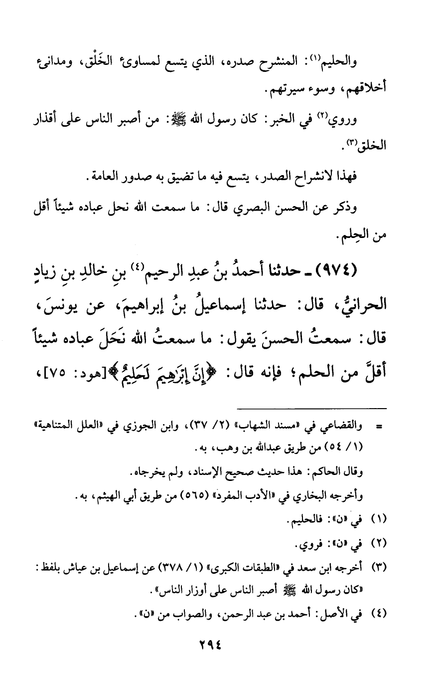 974 - حدثنا أحمد بن عبد الرحيم بن خالد بن زيادٍ الحراني، قال: حدثنا إسماعيل بن إبراهيم، عن يونس، قال: سمعت الحسن يقول: ما سمعت الله نحل عباده شيئاً أقل من الحلم؛ فإنه قال: {إن إبراهيم لحليمٌ}،