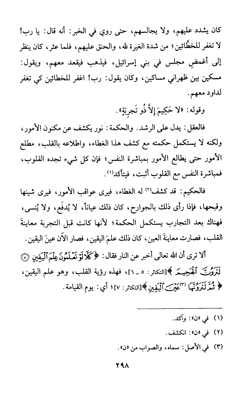 فالحكيم: قد كشف له الغطاء، فيرى عواقب الأمور، فيرى شينها وقبحها، فإذا رأى ذلك بالجوارح، كان ذلك عياناً، لا يدفع، ولا ينسى، فهناك بعد التجارب يستكمل الحكمة؛ لأنها كانت قبل التجربة معاينة القلب، فصارت معاينة العين، كان ذلك علم اليقين، فصار الآن عين اليقين.