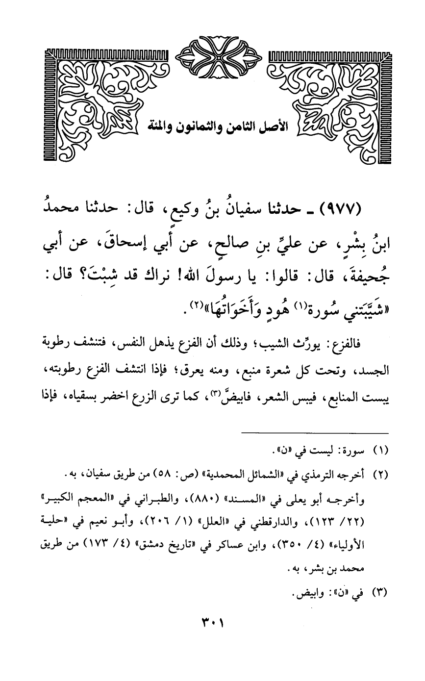 977 - حدثنا سفيان بن وكيعٍ، قال: حدثنا محمد ابن بشرٍ، عن علي بن صالحٍ، عن أبي إسحاق، عن أبي جحيفة، قال: قالوا: يا رسول الله! نراك قد شبت؟ قال: ((شيبتني سورة هودٍ وأخواتها)).
