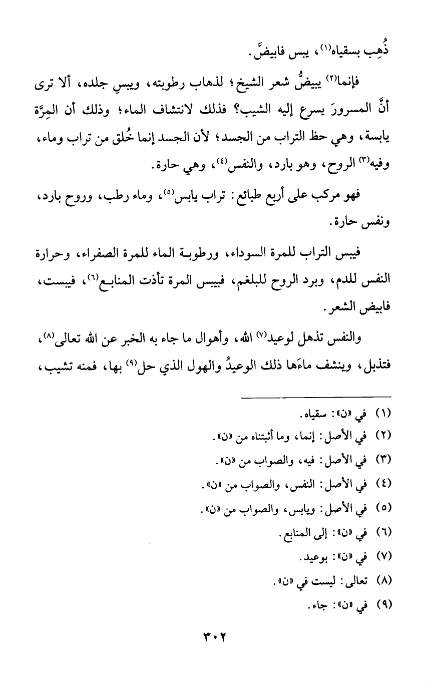 فإنما يبيض شعر الشيخ؛ لذهاب رطوبته، ويبس جلده، ألا ترى أن المسرور يسرع إليه الشيب؟ فذلك لانتشاف الماء؛ وذلك أن المرة يابسة، وهي حظ التراب من الجسد؛ لأن الجسد إنما خلق من تراب وماء، وفيه الروح، وهو بارد، والنفس، وهي حارة.