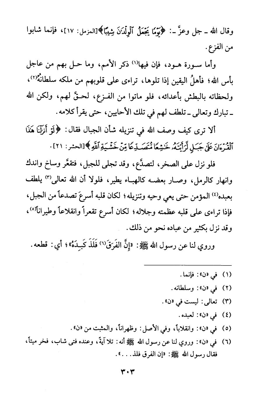 فلو نزل على الصخر، لتصدع، وقد تجلى للجبل، فتقعر وساخ واندك وانهار كالرمل، وصار بعضه كالهباء يطير، فلولا أن الله تعالى يلطف بعبده المؤمن حتى يعي وحيه وتنزيله؛ لكان قلبه أسرع تصدعاً من الجبل، فإذا تراءى على قلبه عظمته وجلاله؛ لكان أسرع تقعراً وانقلاعاً وطيراناً، وقد نزل بكثير من عباده نحو من ذلك.