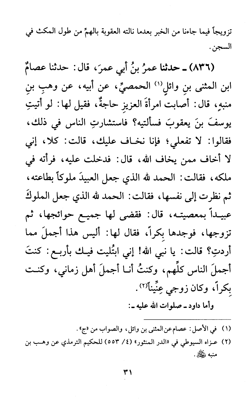 836 - حدثنا عمر بن أبي عمر، قال: حدثنا عصامٌ ابن المثنى بن وائلٍ الحمصي، عن أبيه، عن وهب بن منبهٍ، قال: أصابت امرأة العزيز حاجةٌ، فقيل ها: لو أتيت يوسف بن يعقوب فسألتيه؟ فاستشارت الناس في ذلك، فقالوا: لا تفعلي؛ فإنا نخاف عليك، قالت: كلا، إني لا أخاف ممن يخاف الله، قال: فدخلت عليه، فرأته في ملكه، فقالت: الحمد لله الذي جعل العبيد ملوكاً بطاعته، ثم نظرت إلى نفسها، فقالت: الحمد لله الذي جعل الملوك عبيداً بمعصيته، قال: فقضى لها جميع حوائجها، ثم تزوجها، فوجدها بكراً، فقال لها: أليس هذا أجمل مما أردت؟ قالت: يا نبي الله! إني ابتليت فيك بأربع: كنت أجمل الناس كلهم، وكنت أنا أجمل أهل زماني، وكنت بكراً، وكان زوجي عنيناً.