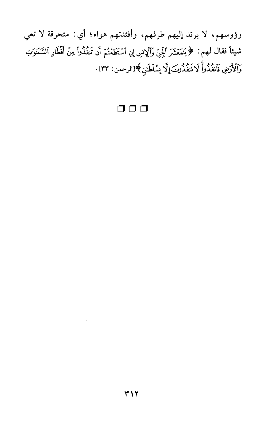 رؤوسهم، لا يرتد إليهم طرفهم، وأفئدتهم هواء؛ أي: متحرقة لا تعي شيئاً فقال لهم: {يا معشر الجن والإنس إن استطعتم أن تنفذوا من أقطار السماوات والأرض فانفذوا لا تنفذون إلا بسلطانٍ}.