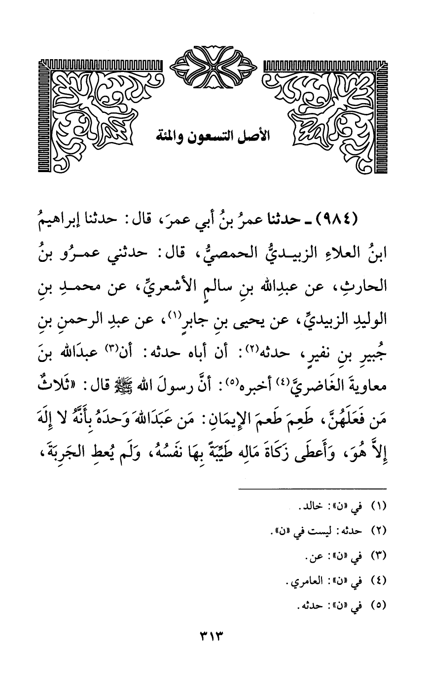 984 - حدثنا عمر بن أبي عمر، قال: حدثنا إبراهيم ابن العلاء الزبيدي الحمصي، قال: حدثني عمر بن الحارث، عن عبد الله بن سالمٍ الأشعري، عن محمد بن الوليد الزبيدي، عن يحيى بن جابرٍ، عن عبد الرحمن بن جبير بن نفيرٍ، حدثه: أن أباه حدثه: أن عبد الله بن معاوية الغاضري أخبره: أن رسول الله صلى الله عليه وسلم قال: ((ثلاثٌ من فعلهن، طعم طعم الإيمان: من عَبَدَ الله وحده بأنه لا إله إلا هو، وأعطى زكاة ماله طيبةً بها نفسه، ولم يعط الجربة،