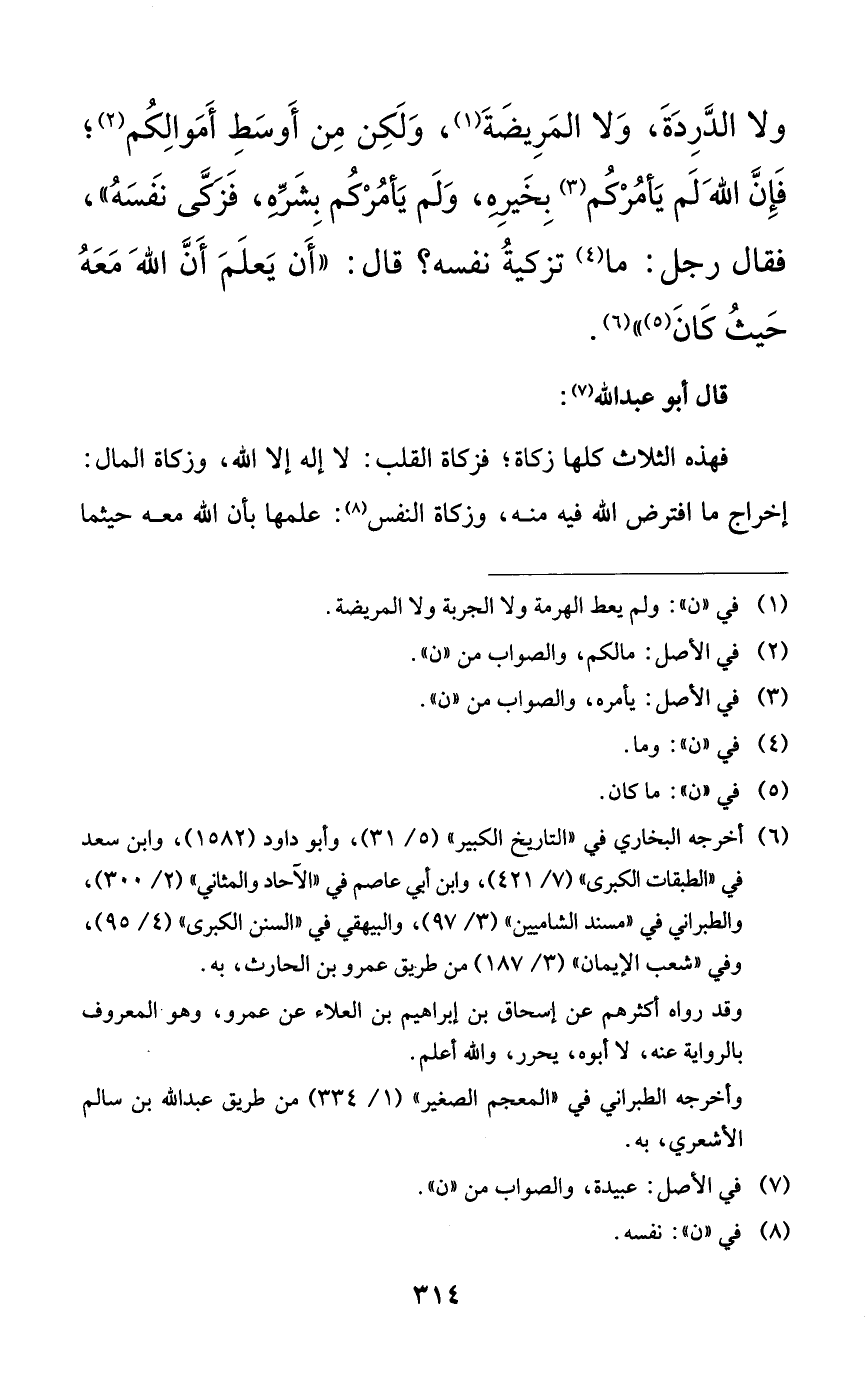 ولا الدرة، ولا المريضة، ولكن من أوسط أموالكم؛ فإن الله لم يأمركم بخيره، ولم يأمركم بشره، فزكى نفسه))، فقال رجل: ما تزكية نفسه؟ قال: ((أن يعلم أن الله معه حيث كان)).