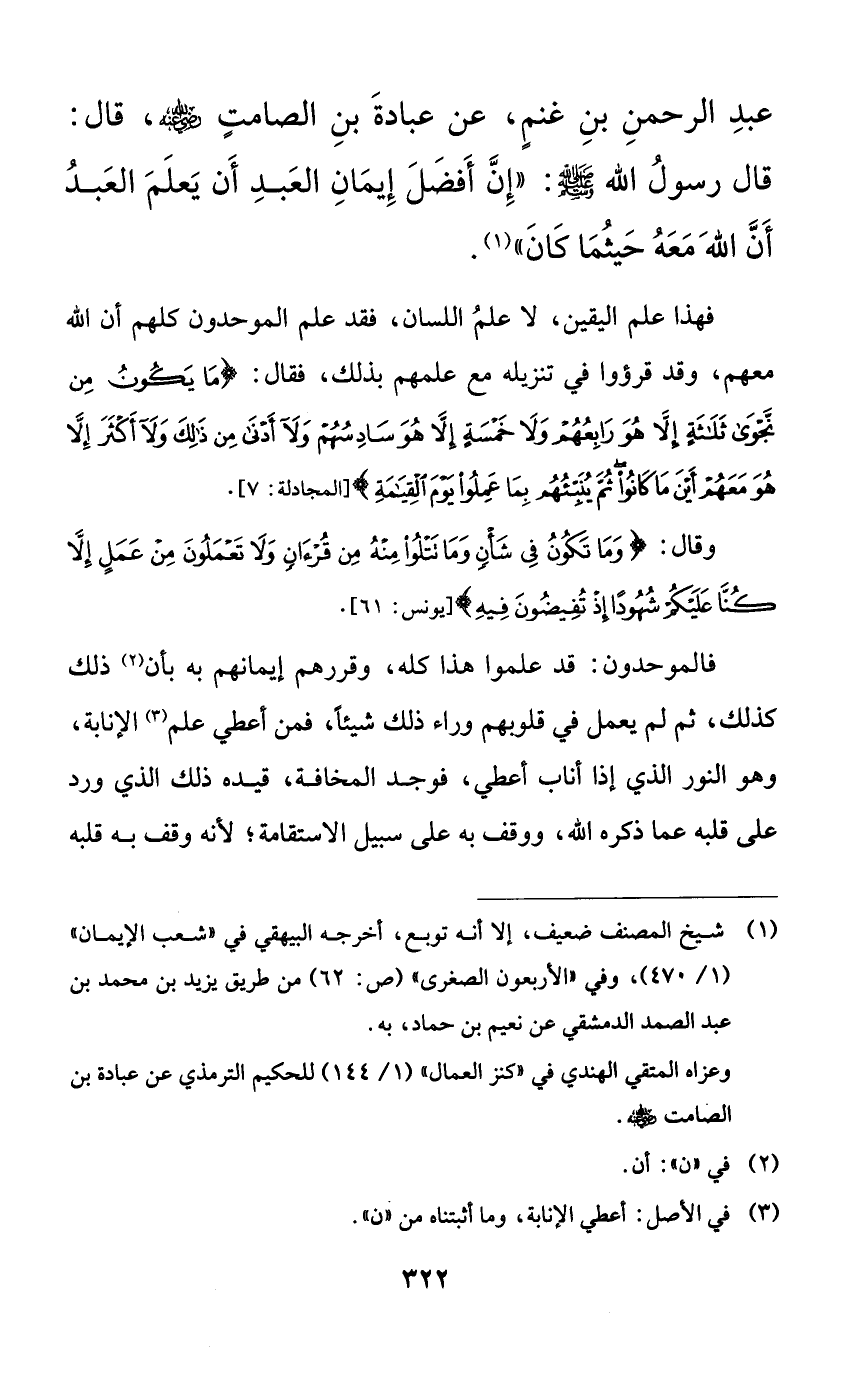 عبد الرحمن بن غنمٍ، عن عبادة بن الصامتٍ رضي الله عنه، قال: قال رسول الله صلى الله عليه وسلم: ((إن الفضل إيمان العبد أن يعلم العبد أن الله معه حيثما كان)).