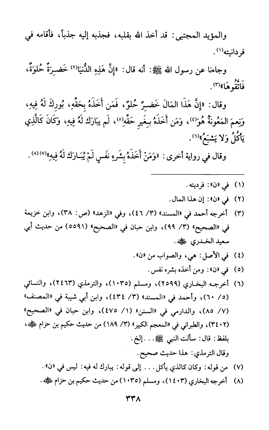 وقال: ((إن هذا المال خضرٌ حلوٌ، فمن أخذه بحقه، بورك له فيه، ونعم المعونة هو، ومن أخذه بغير حقه، لم يبارك له فيه، وكان كالذي يأكل ولا يشبع)).