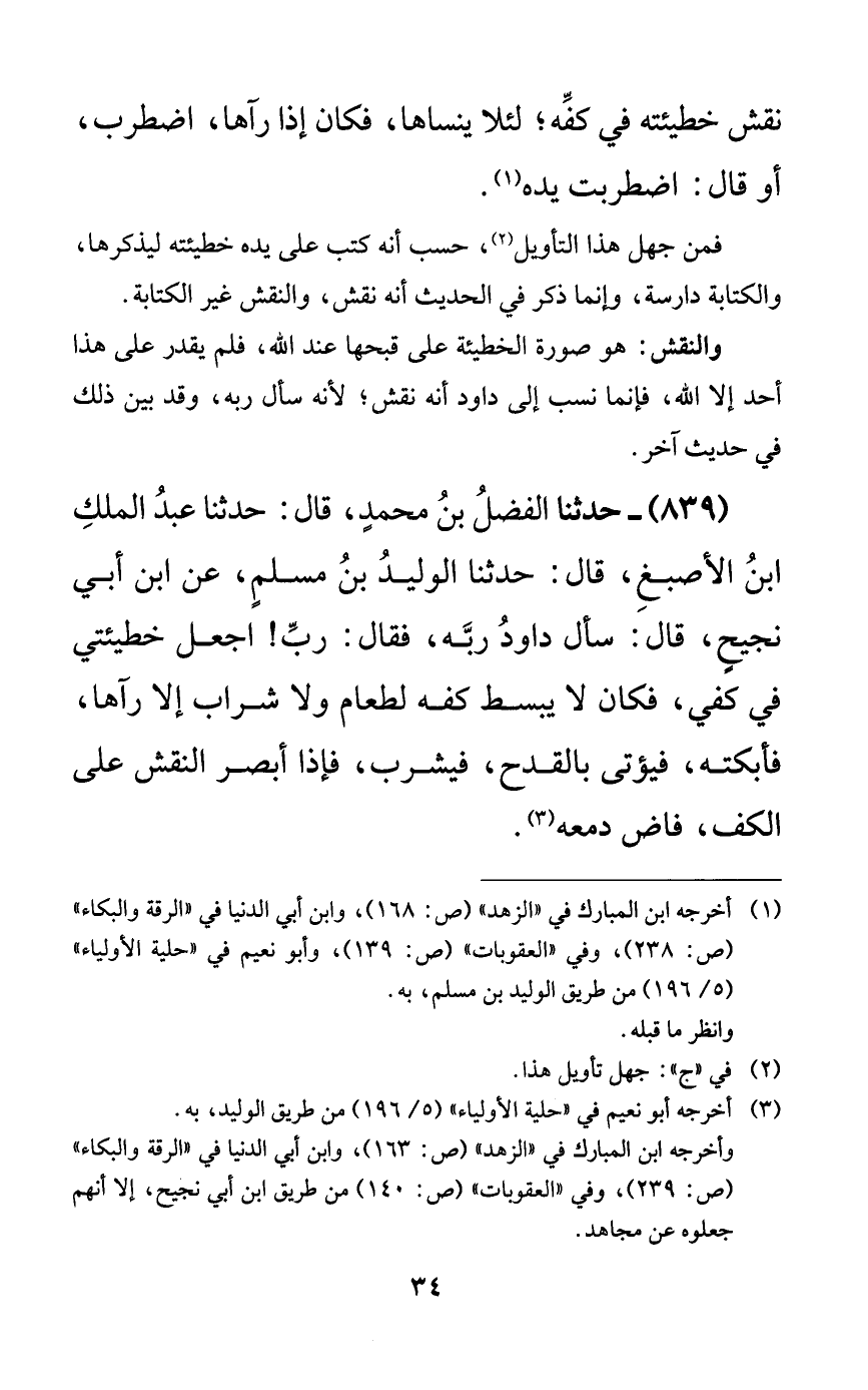 839 - حدثنا الفضل بن محمدٍ، قال: حدثنا عبد الملك ابن الأصبغ، قال: حدثنا الوليد بن مسلمٍ، عن ابن أبي نجيحٍ، قال: سأل داود ربه، فقال: رب! اجعل خطيئتي في كفي، فكان لا يبسط كفه لطعام ولا لشراب إلا رآها، فأبكته، فيؤتى بالقدح، فيشرب، فإذا أبصر النقش على الكف، فاض دمعه.