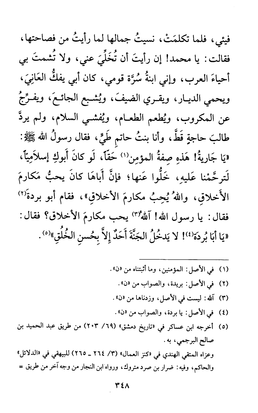 فيئي، فلما تكلمت، نسيت جمالها لما رأيت من فصاحتها، فقالت: يا محمد! إن رأيت أن تخلي عني، ولا تشمت بي أحياء العرب، وإني ابنة سرة قومي، كان أبي يفك العاني، ويحمي الديار، ويقري الضيف، ويشبع الجائع، ويفرج عن المكروب، ويطعم الطعام، ويفشي السلام، ولم يرد طالب حاجةٍ قط، وأنا بنت حاتم طيٍّ، فقال رسول الله صلى الله عليه وسلم: ((يا جارية! هذه صفة المؤمن حقًّا، لو كان أبوك إسلاميًّا، لترحمنا عليه، خلوا عنها؛ فإن أباها كان يحب مكارم الأخلاق، والله يحب مكارم الأخلاق))، فقام أبو بردة فقال: يا رسول الله! آلله يحب مكارم الأخلاق؟ فقال: ((يا أبا بردة! لا يدخل الجنة أحدٌ إلا بحسن الخلق)).