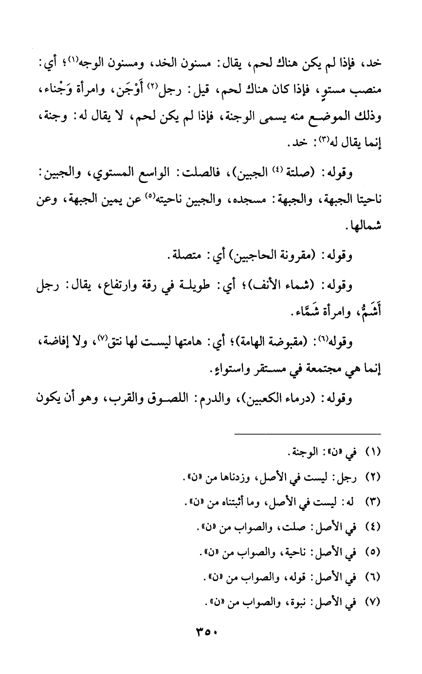 خد، فإذا لم يكن هناك لحم، يقال: مسنون الخد، ومسنون الوجه؛ أي: منصب مستوٍ، فإذا كان هناك لحم، قيل: رجل أوجن، وامرأة وجناء، وذلك الموضع منه يسمى الوجنة، فإذا لم يكن لحم، لا يقال له: وجنة، إنما يقال له: خد.