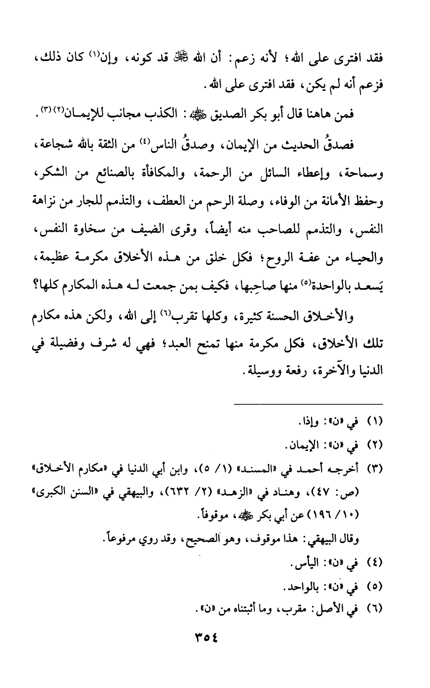 فصدق الحديث من الإيمان، وصدق الناس من الثقة بالله شجاعة، وسماحة، وإعطاء السائل من الرحمة، والمكافأة بالصنائع من الشكر، وحفظ الأمانة من الوفاء، وصلة الرحم من العطف، والتذمم للجار من نزاهة النفس، والتذمم للصاحب منه أيضاً، وقرى الضيف من سخاوة النفس، والحياء من عفة الروح؛ فكل خلق من هذه الأخلاق مكرمة عظيمة، يسعد بالواحدة منها صاحبها، فكيف بمن جمعت له هذه المكارم كلها؟